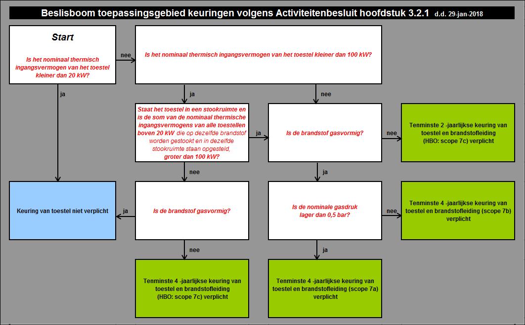 In de onderstaande afbeelding kunt u zien waaraan u moet voldoen en wat de termijn van de keuring is.